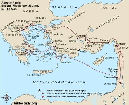 Với chuyến đi thứ nhì, Phaolô từ nay có Sila đồng hành, mở rộng chuyến viễn du về phía Tây, trước tiên bằng đường bộ khi từ Antiokia đi theo đường Tarse (quê nhà của Phaolô) đến Derbé, Lystres, Iconium và Antiokia vùng Pisidie. Mục tiêu ban đầu của chuyến đi này là để thêm sức mạnh đức tin cho những anh em đã gặp trong chuyến đi trước. Nhưng chặng đường ấy lại được nối dài thêm do sức mạnh không mệt mỏi của "đứa con sinh non của Chúa", như Phaolô đã tự gọi mình như thế (Cv 16, 4-9):