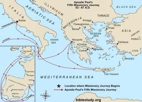 Rời đảo Crète, Phaolô đã đi đến Nicopolis, rồi đến Tây Ban Nha (Rm 15,25-28). Có bằng chứng cho thấy có thể Phaolô cũng đã rao giảng Tin Mừng tại vùng đất Anh Quốc.