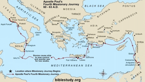 Cuối cùng mãi đến năm 61, Phaolô mới lên tới bờ biển Italia, rồi bị binh lính giải đi bộ cho đến khi chấm dứt trong những nhà tù Rôma khét tiếng.