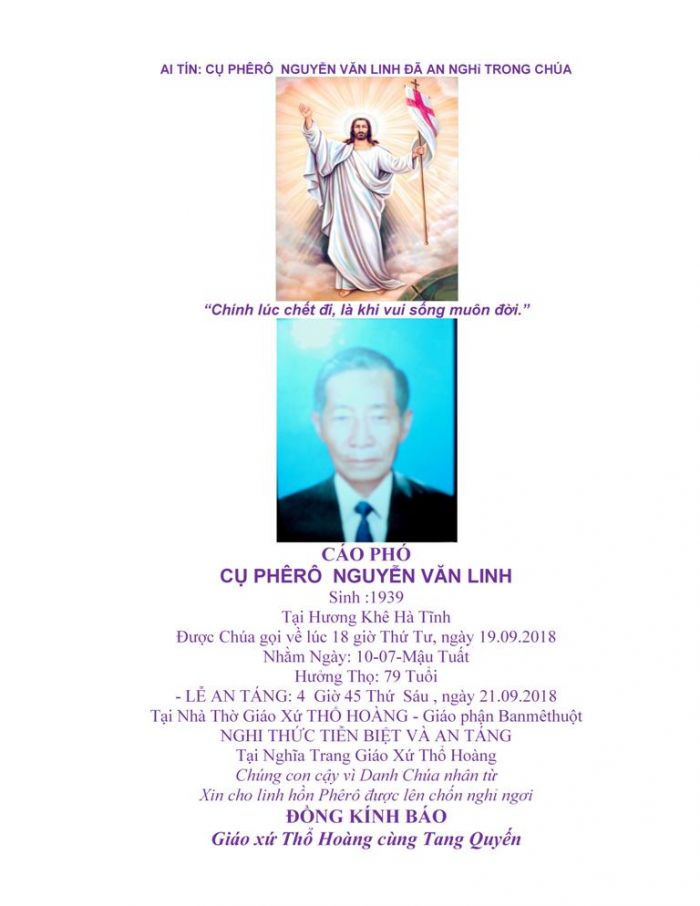 AI TÍN: CỤ PHÊRÔ NGUYỄN VĂN LINH ĐÃ AN NGHỉ TRONG CHÚA