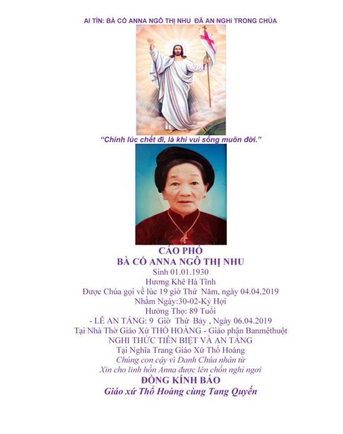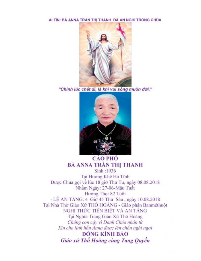 AI TÍN: BÀ ANNA TRẦN THỊ THANH ĐÃ AN NGHỉ TRONG CHÚA