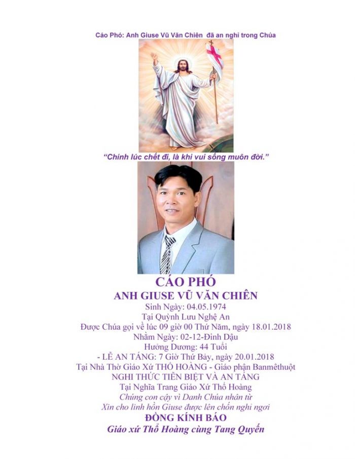 LỄ AN TÁNG: Vào Lúc 4 giờ 45 Ngày 18.01.2020