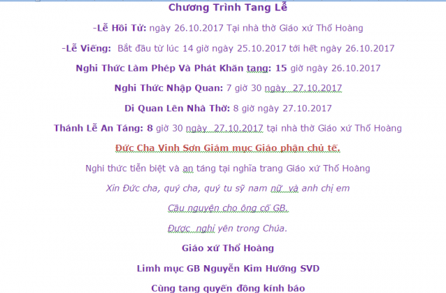 LỄ AN TÁNG: 4 Giờ 45 Thứ Năm Ngày 26.12.2019