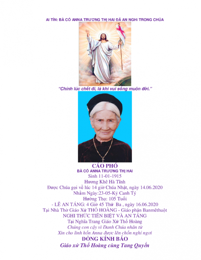 AI TÍN: BÀ CỐ ANNA TRƯƠNG THỊ HAI ĐÃ AN NGHỉ TRONG CHÚA