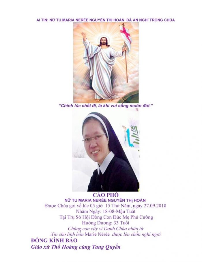 AI TÍN: NỮ TU MARIA NERÉE NGUYỄN THỊ HOÀN ĐÃ AN NGHỈ TRONG CHÚA