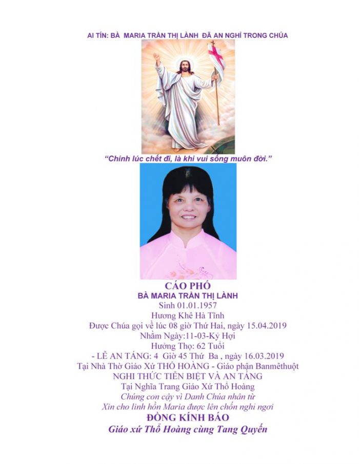 AI TÍN: BÀ MARIA TRẦN THỊ LÀNH ĐÃ AN NGHỈ TRONG CHÚA