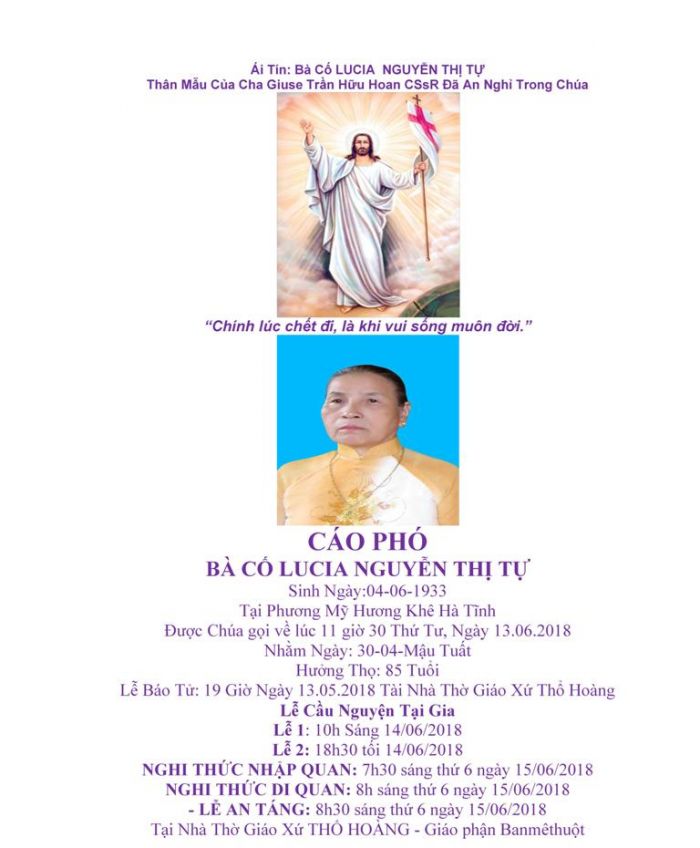 Ai Tín: Bà Cố LUCIA NGUYỄN THỊ TỰ Â Thân Mẫu Của Cha Giuse Trần Hữu Hoan CSsR Đã An Nghỉ Trong Chúa