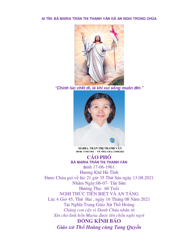 AI TÍN: BÀ MARIA TRẦN THỊ THANH VÂN ĐÃ AN NGHỉ TRONG CHÚA