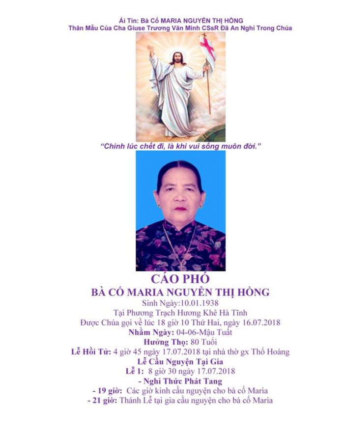 Ai Tín: Bà Cố MARIA NGUYỄN THỊ HỒNG Thân Mẫu Của Cha Giuse Trương Văn Minh CSsR Đã An Nghỉ Trong Chúa
