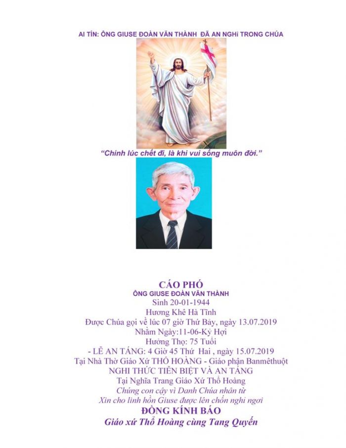 AI TÍN: ÔNG GIUSE ĐOÀN VĂN THÀNH ĐÃ AN NGHỈ TRONG CHÚA