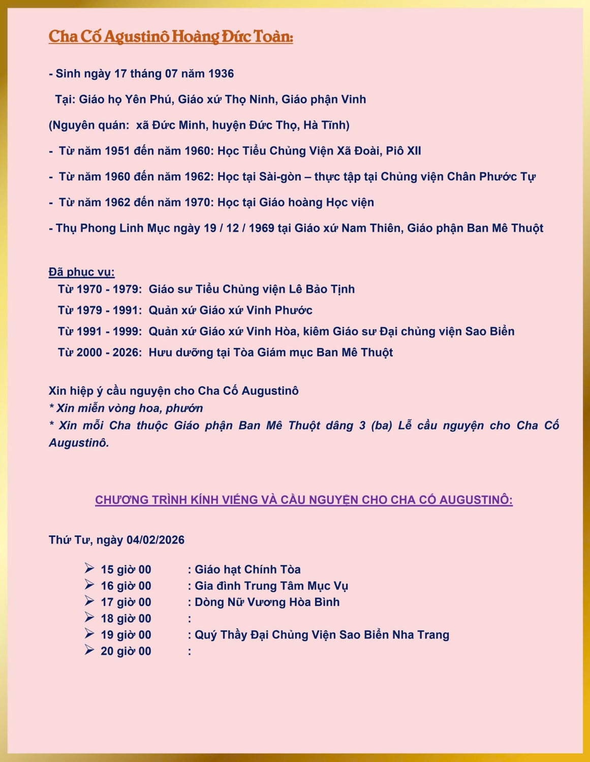 * Xin mỗi Cha thuộc Giáo phận Ban Mê Thuột dâng 3 (ba) Lễ cầu nguyện cho Cha Cố Augustinô.