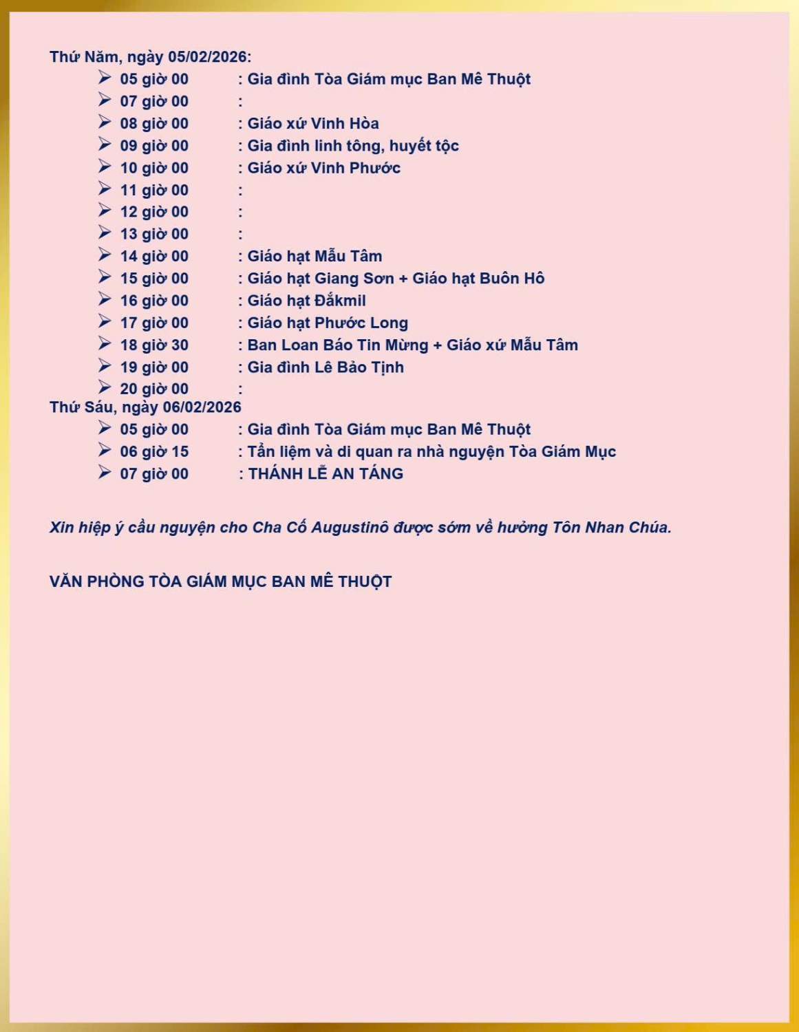 ➤ 05 giờ 00: Gia đình Tòa Giám mục Ban Mê Thuột