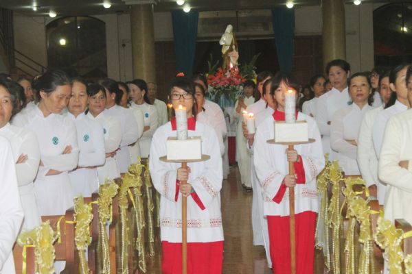 Rộn ràng bởi những bước chân hồ hởi dâng trào niềm vui của hơn 300 người mẹ trong giáo xứ nghiêm trang trong đoàn rước từ hội trường kiệu tượng thánh nữ Monica tiến vào thánh đường hiệp dâng thánh lễ mừng kính vị thánh nữ là mẫu gương và là Đấng bảo trợ cho các bà mẹ Công giáo, mừng kính một người mẹ là mẫu gương của đời sống đức tin ngời sáng, cả cuộc đời cầu nguyện liên lỉ, tín thác trọn vẹn vào Chúa.