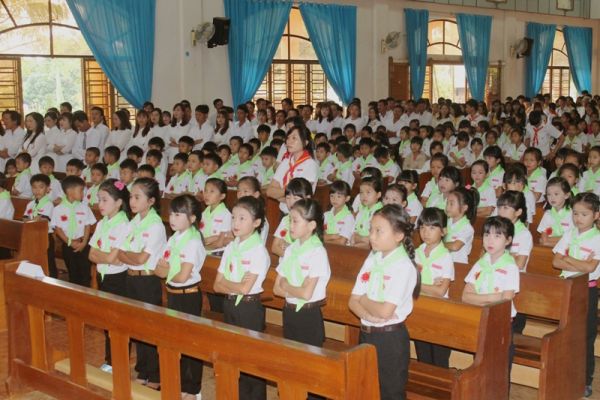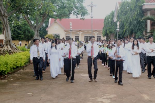 Bắt đầu thánh lễ là đoàn rước gồm các em rước lễ lần đầu, quý phụ huynh cùng quý anh chị huynh trưởng, giáo lý viên, mọi người đều hân hoan, nghiêm trang sốt sắng tiến vào nhà thờ trong tiếng hát rộn ràng và thánh thót của hơn 60 em ca đoàn Thánh Linh, ca đoàn của thiếu nhi, khiến cho bầu khí của buổi sáng Cao Nguyên đầy nắng thêm phần linh thiêng.