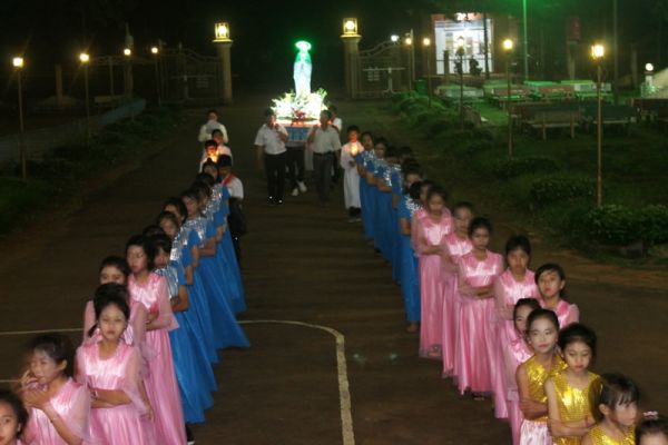 - Cộng đoàn nghiêm trang kiệu Đức Mẹ từ nhà thờ ra quảng trường tiền vào nhà thờ, vưa đi vừa nghe suy niệm từng mầu nhiệm và sốt săng dâng lời kinh Mân côi lên Mẹ.