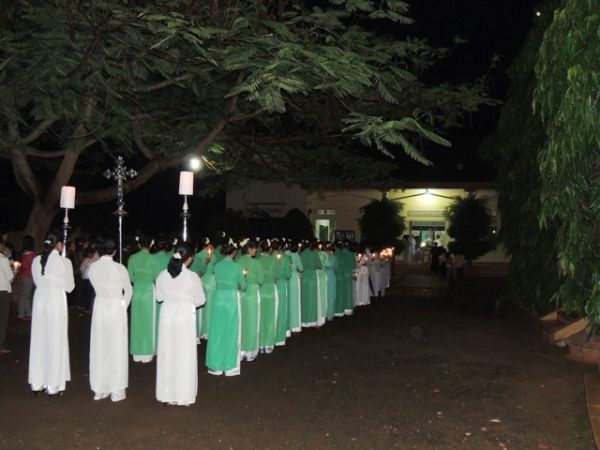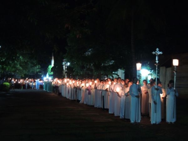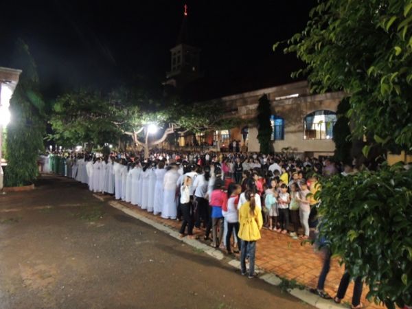 Và quả thật điều kỳ diệu đã tới, 18 giờ 30 cơn mưa nhẹ dần và tạnh hẳn, đã có khoảng 500 người dưới sự điều hành của người hướng dẫn và đặc biệt của cha Quản xứ đã tiến về phía hội trường chuẩn bị hàng lối và nghe cha phổ biến một số quy đinh cho đoàn rước được được nghiêm trang và thể hiện được tính đức tin trong việc làm đạo đức nầy.
