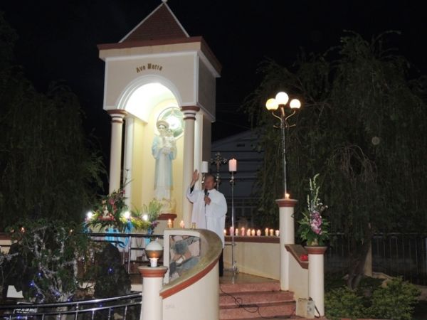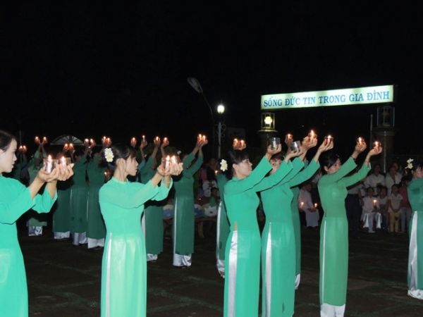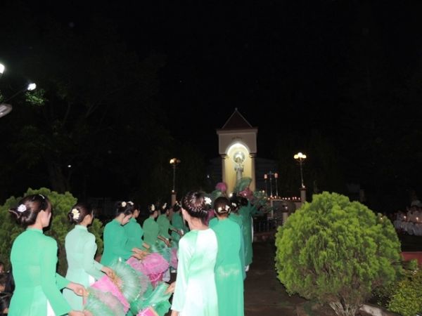Sau lời nhắn nhủ của cha quản xứ, cuộc rước kiệu bắt đầu bằng bài đồng diễn của cả trăm người giơ cao ánh nến lung linh hướng về kiệu Mẹ với lời ca trìu mến: ”Mẹ ơi trước nhan Mẹ con dâng về Mẹ, một tràng hoa Mân côi và ngàn lời ca chan chứa tình yêu….”, Đoàn rước tiến về Đài Đức Mẹ chậm rãi, khoan thai và nghiêm trang với suy niệm 5 mầu nhiệm vui, với suy niệm nầy đã giúp cộng đoàn sống đức tin cùng với Mẹ từ biến cố truyền tin, Mẹ thăm viếng bà Êlidabet, Sinh đức Chúa Giê-su trong hang đá, dâng Chúa trong Đền thánh và tìm gặp Chúa trong Đền thánh, giúp mọi người biết khiêm nhường nhìn nhận sự thật: “mình là những tạo vật tùy thuộc hoàn toàn vào Thiên Chúa toàn năng, biết phục vụ Chúa và mọi Người trong tình yêu thương, biết cảm tạ và dùng mọi tài năng, sức lực Chúa ban để phục vụ những anh chị em từ trong gia đình đến những người mà chúng ta gặp gỡ mỗi ngày, biết sống tinh thần khó nghèo, không coi tiền của như mục đích của đời mình, nhưng chỉ xử dụng tiền của vật chất như là phương tiện để phục vụ sự sống, làm việc bác aí, và tôn danh Chúa, biết từ bỏ ý riêng mà vâng theo thánh ý Chúa trong hoàn cảnh của cuộc đời, và đặc biệt xin Mẹ đoái thương nhìn đến giới trẻ phải chiến đấu với đờì sống vô thần thực tiễn đang cám dỗ từ bỏ, hoặc dửng dưng với niềm tin vào Chúa.