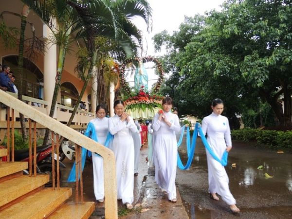 16 giờ 45 cuộc kiệu hoa cung nghinh Mẹ từ Hội trường nhà xứ tới tiền sảnh nhà thờ bắt đầu được tiến hành, trời vẫn còn mưa nhẹ nhưng đoàn rước vì lòng yêu mến Mẹ đã nghiêm trang cung nghinh Mẹ trong tiêng hát cộng đoàn với lời ca quen thuộc thiết tha và trìu mến: " Lạy Mẹ Maria Mẹ Thiên Chúa Mẹ đồng trinh....".