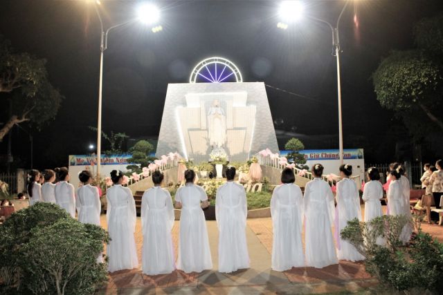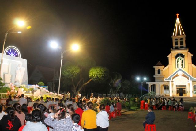 Vào lúc 19 giờ, cha quản xứ Giuse đã chủ trì giờ suy niệm Mầu Nhiêm Mân Côi năm sự Vui tại Đài Đức Mẹ của giáo xứ.