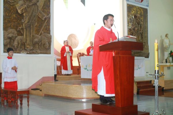 Lời đầu lễ cha chủ tế Giuse Hoàng Đức Nhúng giới thiệu ngày lễ Chúa Thánh Thần hiện xuống là ngày khai sinh ra Giáo gội, đồng thời mời gọi cộng đoàn hiệp ý lời tạ ơn Thiên Chúa, cầu nguyện cho cha quản xứ, toàn thể cộng đoàn cũng như cầu nguyện cho các tiền nhân trong giáo xứ đã rời cõi thế....