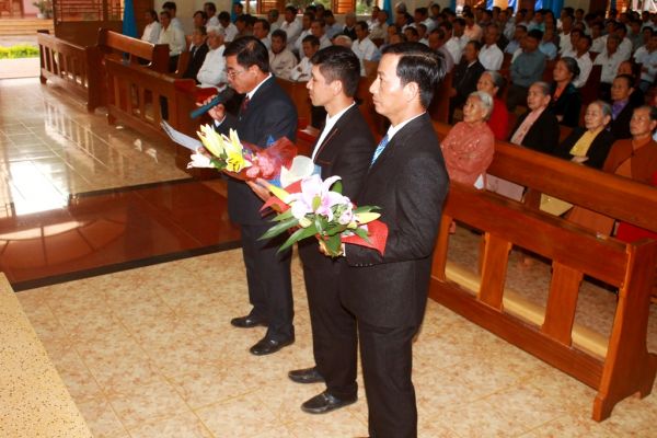 Sau lời nguyện hiệp lễ, đại diện thường vụ hội đồng giáo xứ đã gởi lời tri ân và chúc mừng 2 cha mới bằng bó hoa tươi thăm.