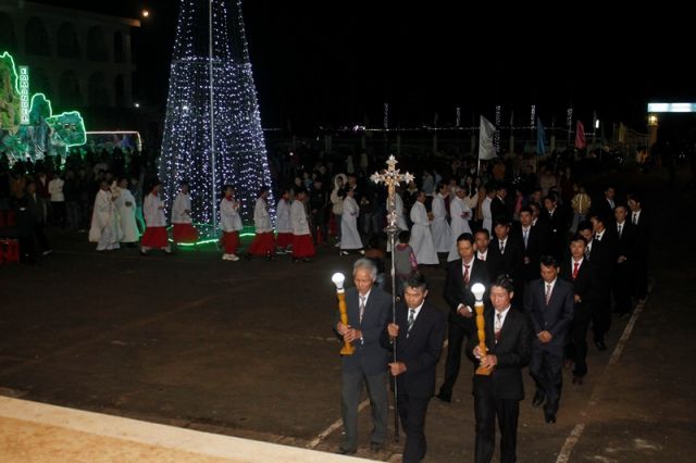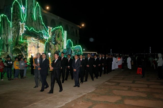 Sau giờ canh thức , đúng 19 giờ 45, cha Giuse đã làm phép tượng Chúa Hài Đồng và hang đá ngoài tiền sảnh nhà giáo lý, rồi cùng với cha Giuse Trần Thanh Hải, SVD long trọng cung nghinh Chúa Hài Đồng tiến vào nhà thờ cử hành đại lễ Giáng Sinh 2020.