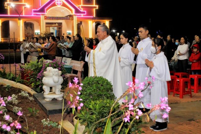 Thánh lễ trọng thể Đức Mẹ Lộ Đức do cha quản xứ Giuse Trần Thế Thành chủ sự và thầy Phó tế Augustino Phan Minh Danh phụ tế được bắt đầu vào lúc 5 giờ thứ hai ngày 13/02/2023, tại Đài Đức Mẹ Ban Ơn Giáo xứ.