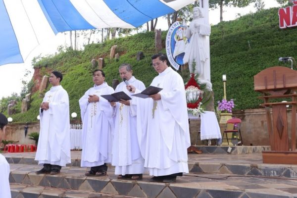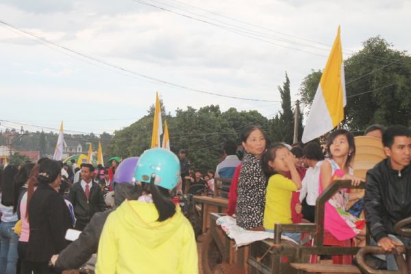 Một con mưa rất lớn và kéo dài từ lúc 13 giờ đến gần 15 giờ, nên giờ khai mạc diễn ra trễ hơn dự định, mục đích để chờ đoàn người đông đảo của 2 giáo xứ tuôn về bằng đủ mọi phương tiện, xe máy, xe taxi, xe autô, đặc biệt đoàn xe càng hàng trăm chiếc của giáo xứ Xuân Lộc do cha phó Antôn Nguyễn Thanh Tường dẫn đầu có cắm cờ Hội Thánh chở giáo dân hành hương về đồi Thánh Tâm,