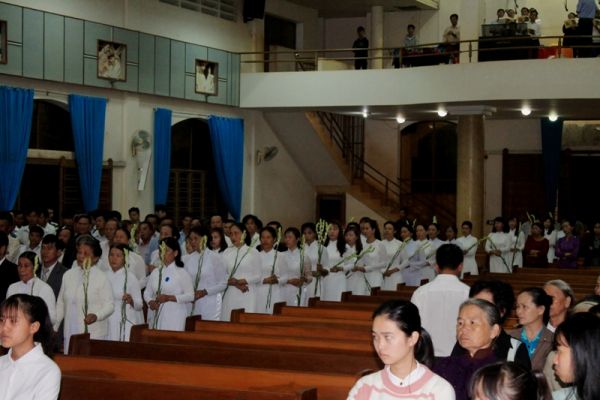 Đúng 19 giờ giáo xứ Thổ Hoàng bắt đầu cuộc rước kiệu Mẹ Maria và thánh Giuse khai mạc tháng hoa.