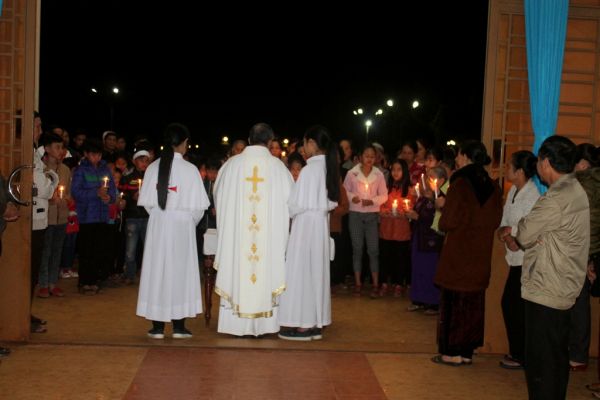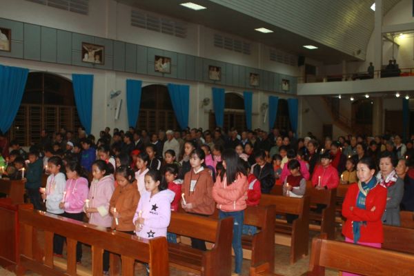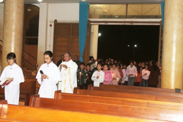 Lúc 4 giờ 45 phút, đông đảo giáo dân đã tập trung trước tiền sảnh nhà thờ để tham dự vào nghi thức làm phép nến và ban phép lành cho trẻ em.