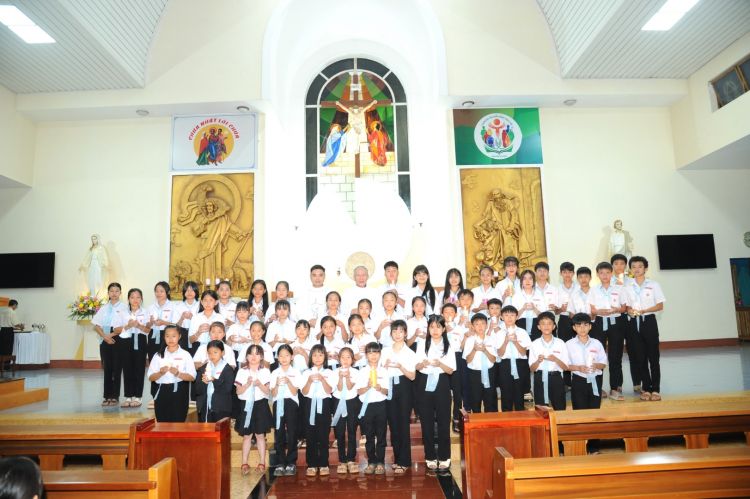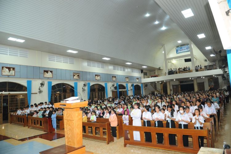 Cùng đồng tế có cha quản xứ Giuse Trần Thế Thành vơi sự tham dự của các em thiếu nhi, các bà mẹ có con nhỏ và đặc biệt của hơn 60 em lớp ơn gọi đã quy tụ về đây hiệp cùng với Mẹ dâng cuộc đời mình cho Thiên Chúa.