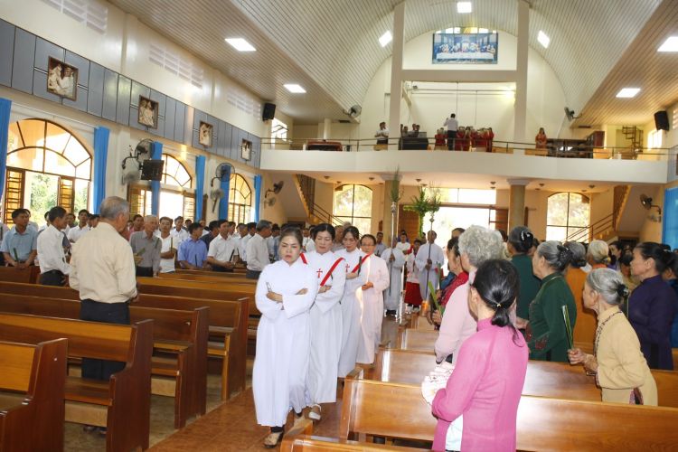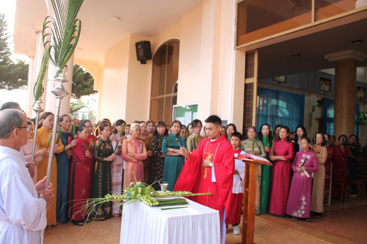 Trước Thánh lễ, cha chủ tế Augustino cử hành nghi thức Tưởng niệm Chúa Giêsu vào thành Thánh Giêrusalem trước tiền sảnh nhà thờ gồm nghi thức làm phép lá và cuộc rước tưng bừng tiến vào nhà thờ cử hành thánh lễ.