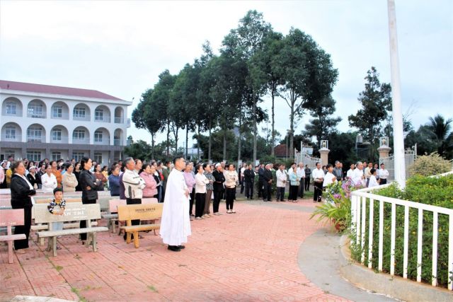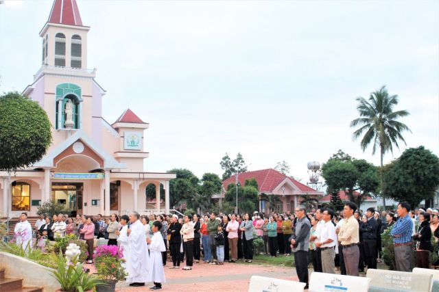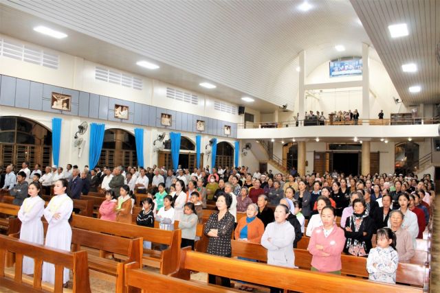 Thánh lễ dự tính sẽ cử hành tại Đài Đức Mẹ, nhưng vì thời tiết không thuận lợi nên cha quản xứ quyết định cử hành trong nhà thờ.