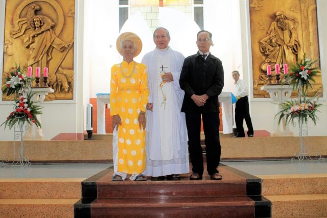 Kết thúc thánh lễ, cha quản xứ đã ghi hình lưu niệm với ông bà và con cháu