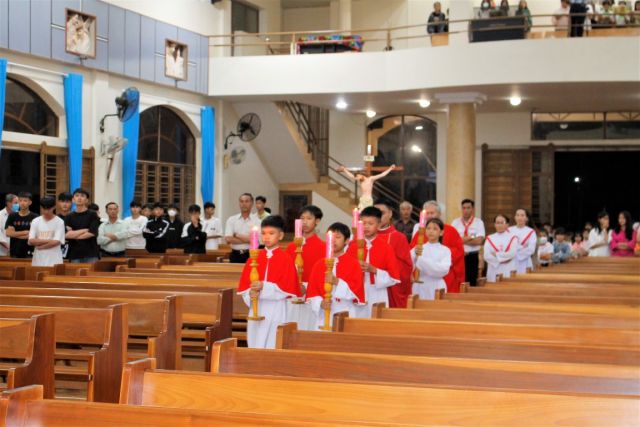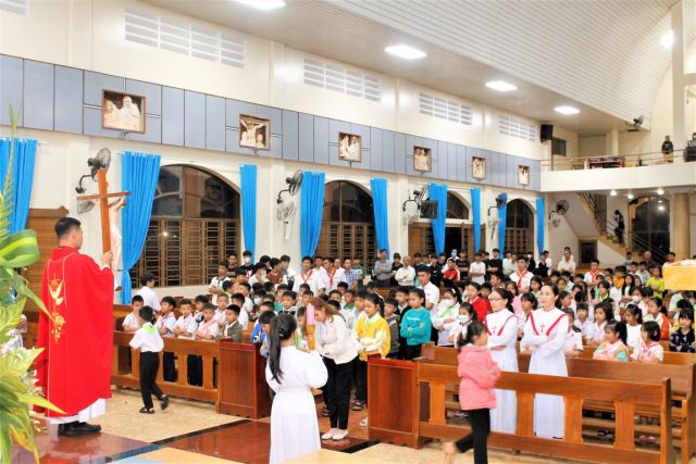 Lúc 19 giờ thứ năm ngày 14 tháng 09 năm 2023, cơn mưa nặng hạt đã dừng, đông đảo các em thiếu nhi cùng cộng đoàn dân Chúa bắt đầu đoàn rước Thánh Giá trọng thể từ tiền sảnh nghiêm trang tiến vào nhà thờ để được cùng với Giáo hội toàn cầu hiệp dâng thánh lễ Suy Tôn Thánh Giá.