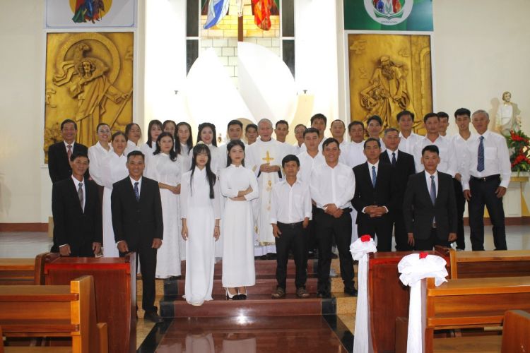 Kết thúc Thánh lễ, cha chủ tế và cha phó đã ghi hình lưu niệm với anh chị em thanh trung niên giáo họ Giuse.
