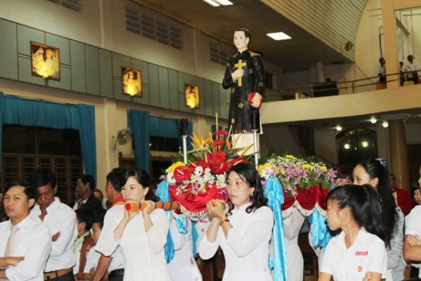 Thánh lễ trọng thể do cha quản xứ Giuse Trần Thế Thành chủ sự cùng với sự tham dự đông đảo của giáo dân được bắt đầu vào đúng 4 giờ 45 bằng đoàn rước tượng thánh nhân từ hội trường nhà xứ vào thánh đường giữa tiếng trống hào hùng và tiếng chiếng thánh thót như tiếng vọng của hồn thiêng sông núi, tiếng vọng hào hùng của người con đất Việt hiên ngang bước chân ra pháp trường minh chứng cho một tình yêu vĩ đại, tình yêu của Đức Kitô đã chết cho loài người và đã sống lại được hòa trong tiếng hát vang rền: “Hồi chiêng dứt tiếng đầu rơi chốn pháp trường. Hồn thiêng lâng lâng về thiên quốc xa vời. Từ nay thôi những ngày tân khổ u buồn, về quê phúc vinh hưởng nhan Chúa muôn đời.”