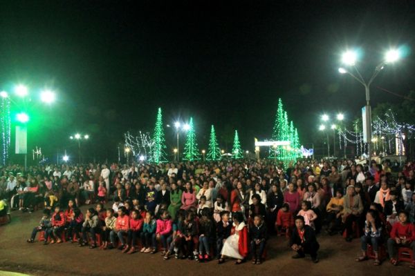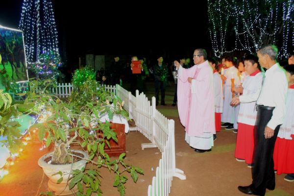 Trời vào đông nên mới 18 giờ trời đã tối, ánh sáng của ban ngày đã nhường lại cho ánh sáng lấp lánh muôn màu của những bóng điện chớp lung linh huyền ảo chiếu sáng trên toàn giáo xứ.