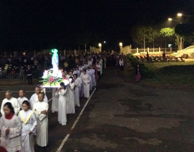 Trước thánh lễ, tại tượng đài Đức Mẹ Mân côi, Cha quản xứ Giuse Trần Thế Thành mặc lễ phục hiệp với cộng đoàn suy niệm và lần chuỗi Mân Côi, đồng thời chủ sự nghi thức kiệu rước cung nghinh Đức Mẹ từ tượng đài tiến vào nhà thờ với sự tham dự của tất cả mọi thành phần trong Giáo xứ.