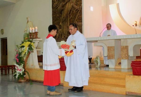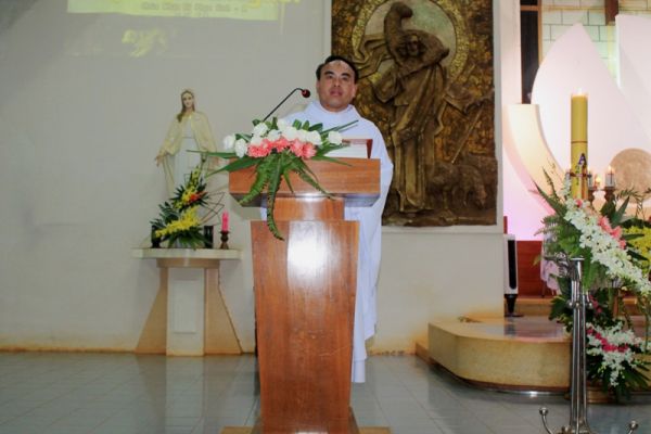 Lời chia sẻ đầu lễ ngài đã gởi tâm tình tạ ơn Thiên Chúa, cảm ơn cộng đoàn hiện diện cũng với những người thân quen đã khuyến khích và cầu nguyện cho ngài theo đuổi ơn gọi, ngài nói:”con trở về đây với giáo xứ mẹ, với mảnh đất Thổ Hoàng thân thương, chinh nơi nầy đã vun trồng cho ơn gọi của con, đã giáo dục và vun trồng những bài học giáo lý,nhân bản, tâm, sinh lý qua phong trào Thiếu Nhi Thánh Thể….”