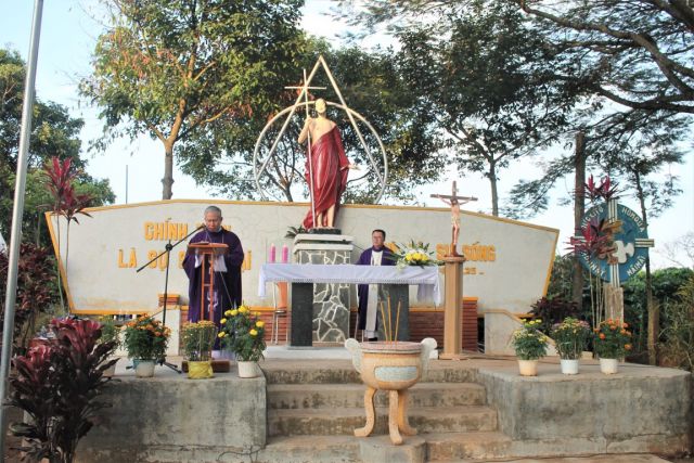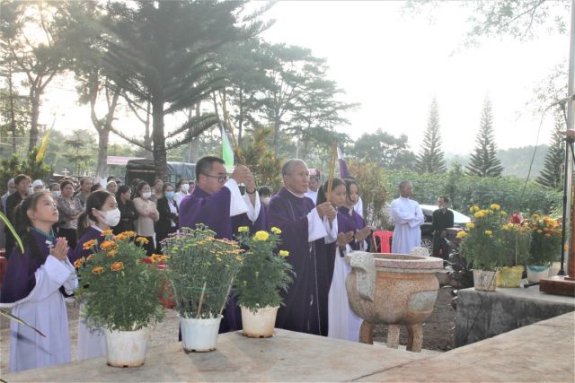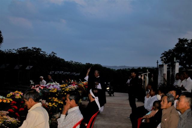 Kết thúc thánh lễ hai cha đã đi rảy nước thánh trên các phần mộ, cũng chính lúc nầy mặt trời tắt , khung cảnh càng thánh thiêng, gần gũi và bình yên.