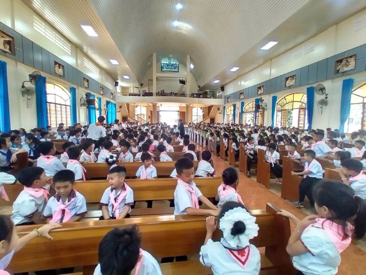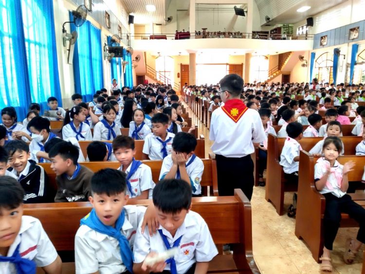 Kết thúc Thánh lễ, các em thiếu nhi ở lại giao lưu cùng quý thầy Vinh Sơn.