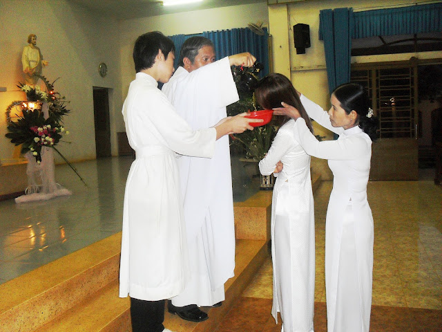 Sau nghi lễ cầu xin và thống hối, lời nguyện trừ tà và xức dầu dự tòng, nghi lễ làm phép nước thánh hiến nước Rửa tội, 7 anh chị em gồm Maria Khằm Thị Hồng, Maria Vi Thị Hương, Maria Nguyễn Thị Mai,Maria Nguyễn Thị Việt Hòa, Têrêxa Trương Thị Lệ Huyền, Giu Se Phạm Văn Hồng, Phaolô Y La ( Buôn Krông) đã tuyên bố từ bỏ tà thần, tuyên xưng đức tin và chịu phép Rửa tội,, xức dầu sau rửa tội,, mặc áo trắng, trao nến sáng và chịu phép Thêm sức.