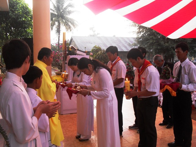 Trong phần dâng lễ vật, cộng đoàn phụng vụ đã được hướng dẫn hãy hợp lòng mình trong từng lễ vật dâng để biểu hiện lòng tin vào Thiên Chúa và tỏ lòng biết ơn bởi muôn vàn ân huệ Chúa đã thương ban cho mỗi người trong suốt cuộc đời, đồng thời cũng dâng lên Chúa công đức của các Thánh Tử Đạo Việt Nam, của các vị truyền giáo, của Đức cố Giám mục tiên khởi Phêrô, 2 Đức cố Giám mục Giuse, Đức Giám mục Vinh Sơn Giám mục Giáo phận cùng toàn thể quý cha quản xứ đã và đang chăn dắt đoàn chiên của Giáo xứ, của các vị tiền nhân, ông bà cha mẹ đã dày công chuyển tải, giáo dục đức tin cho con cháu và xây dựng Giáo xứ tươi đẹp như ngày hôm nay.