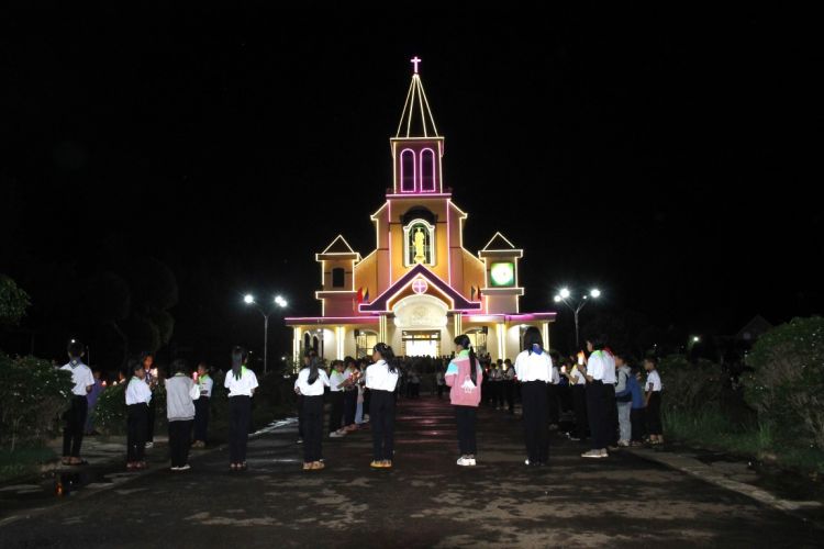 Kết thúc thánh lễ, thời tiết tốt hơn, nên các em trong nhóm ơn gọi với nến sáng trên tay cùng với quý cha và cộng đoàn tiến ra đài Đức Mẹ lần chuỗi, và dâng lên Mẹ muôn sắc hoa và ánh nến lung linh để xin đươc tan chảy như nến cháy rồi cùng với Mẹ lên đường đến với mọi người anh em.