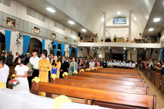 Mở đầu thánh lễ, cha chủ tế Giuse gởi lời chúc mừng Hồng Ân Kim Khánh và mời gọi cộng đoàn hiệp với ông bà cố Giuse Trần Hữu Long và Anna Nguyễn Thị Thanh tạ ơn Chúa vì 50 năm qua được tràn đầy ơn Chúa, được sống trong an vui, hạnh phúc của đời sống hôn nhân với 6 người con và 9 cháu nội ngoại.