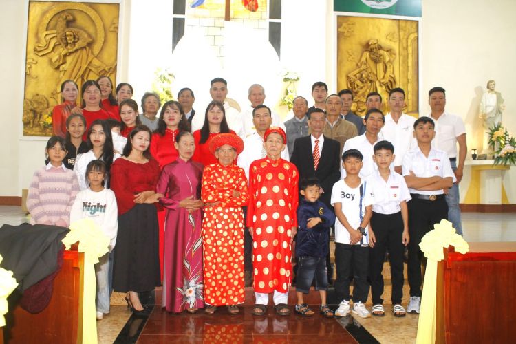 Kết thúc thánh lễ, quý cha đã ghi hình lưu niệm với 2 cụ và con cháu.