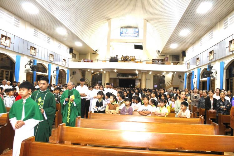 Phần giảng lễ, cha chủ tế Giuse nhắc lại lệnh truyền của Chúa Giêsu trước khi về trời: “Các con hãy đi giảng dạy muôn dân, làm phép rửa cho họ nhân danh Cha, và Con và Thánh Thần..” , ngài nhăn nhủ cộng đoàn: Chúa Giêsu sai các môn đệ cũng có nghĩa là sai mọi người chúng ta, ra đi rao giảng là trách nhiệm gắn liền với mọi người Kitô hữu. Bao lâu còn là Kitô hữu, bấy lâu còn phải loan báo Tin Mừng.