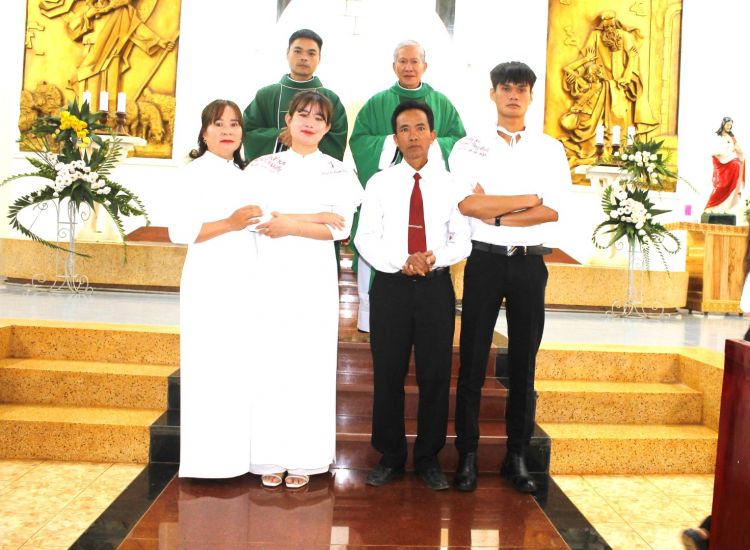 Thánh lễ kết thúc, cha quản xứ và cha phó đã chụp hình chung với các anh chị tân tòng và thân nhân.
