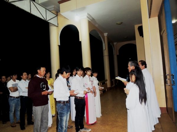 Mở Đầu thánh lễ, 5 anh chị dự tòng: Đa-minh Phạm Văn Thuần, Giuse Nguyễn Đức Trí, Lucia Hoàng Thị Chí, Maria Nguyễn Thị Lệ Thủy và Têrêxa Lê Thị Cẩm Hằng cùng với bố mẹ đỡ đầu và thân nhân tập trung trước cửa tiền sảnh để chứng kiến nghi thức thẩm vấn các dự tòng, sau nghi thức thẩm vấn và lời mời gọi mọi người hân hoan vào nhà thờ tham dự thánh lễ của cha chủ tế Giu-se, mọi người nghiêm trang tiến vào nhà thờ trong rộn ràng tiếng hát của cộng đoàn:” Được Chúa kêu mời nắm giữ tinh thần duy nhất, nhờ liên lạc bình an ta chung tiếng xưng tụng rằng: Chỉ một Chúa một đức tin một phép rửa một Thiên Chúa là Cha” ( Được Chúa kê mời).